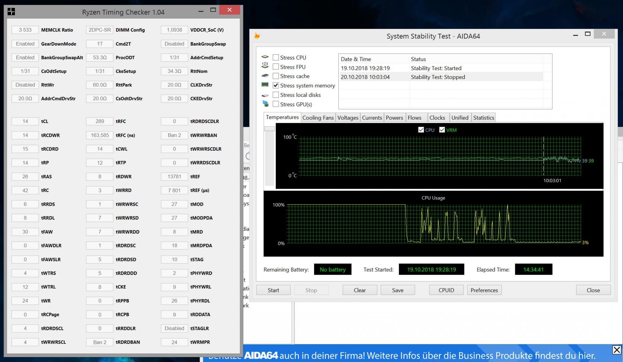 DDR4 3533 C14-14-14-28 1T mit 1,425v und scharfen Subs ( Stilts fast 3200 preset mit 3533er Ramtakt ) laufen ebenso nicht stabil mit allem aktiv.