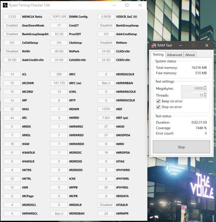 DDR4 3533 C14-14-14-28 1T mit 1,400v und scharfen Subs ( Stilts fast 3200 preset mit 3533er Ramtakt ) laufen scheinbar rockstable mehrere Stunden mit memory test only aktiv.
