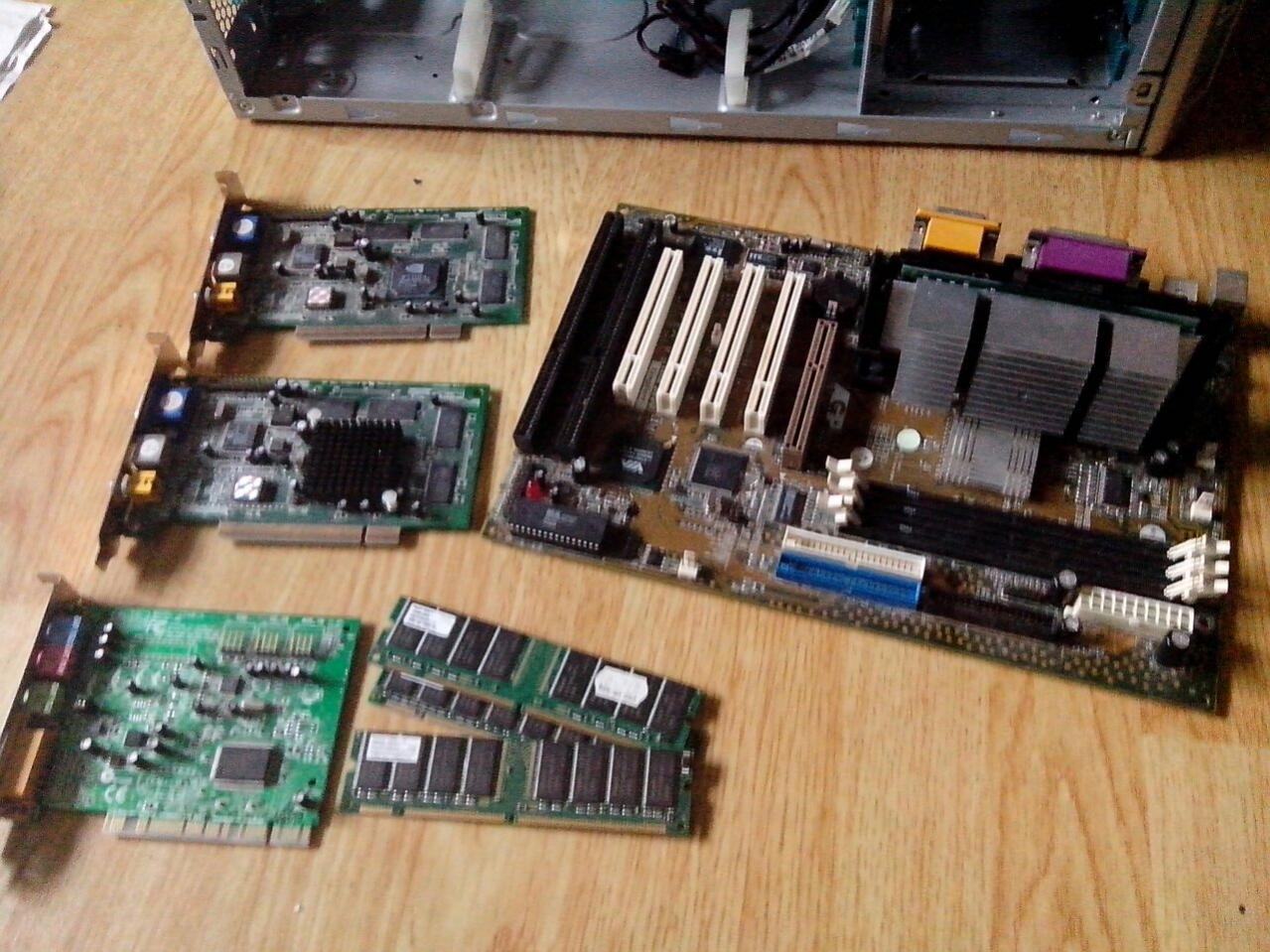 Board müsste eines von Chaintech sein glaube ein 6VTA3. Als Grafikkarte 2x eine Sparkle SP5300T mit jeweils 32MB als PCI. CPU ist ein Intel Celeron mit 433MHz welcher auf einem PGA370 zu Slot1 Adapter sitzt. Ram sind 3x SDRam und ergeben zusammen 512MB. Netzteil ist das einzigste, was mir net gefällt, da es zu klein ist. Sonst noch ne Unspektakuläre PCI Soundkarte.