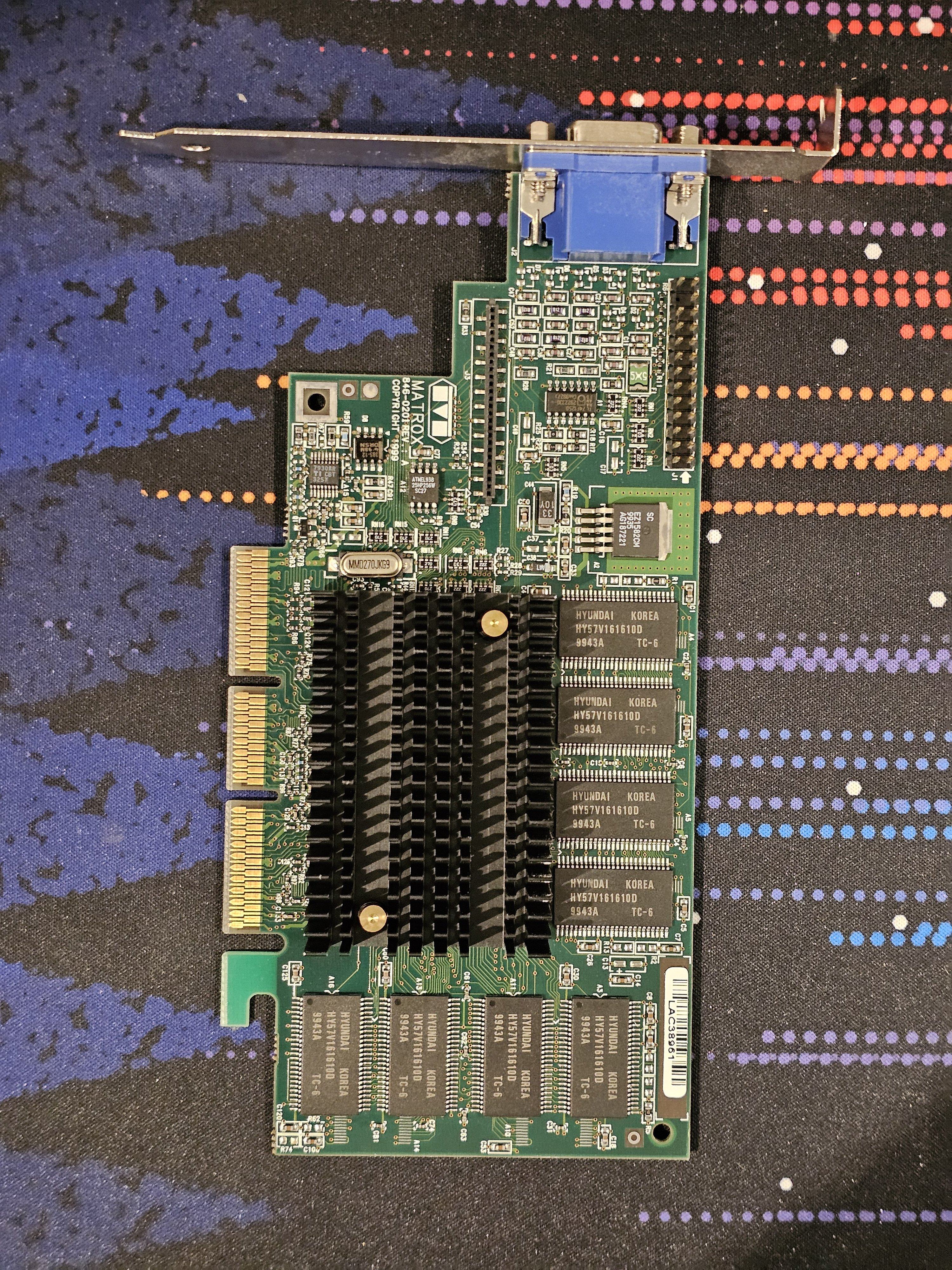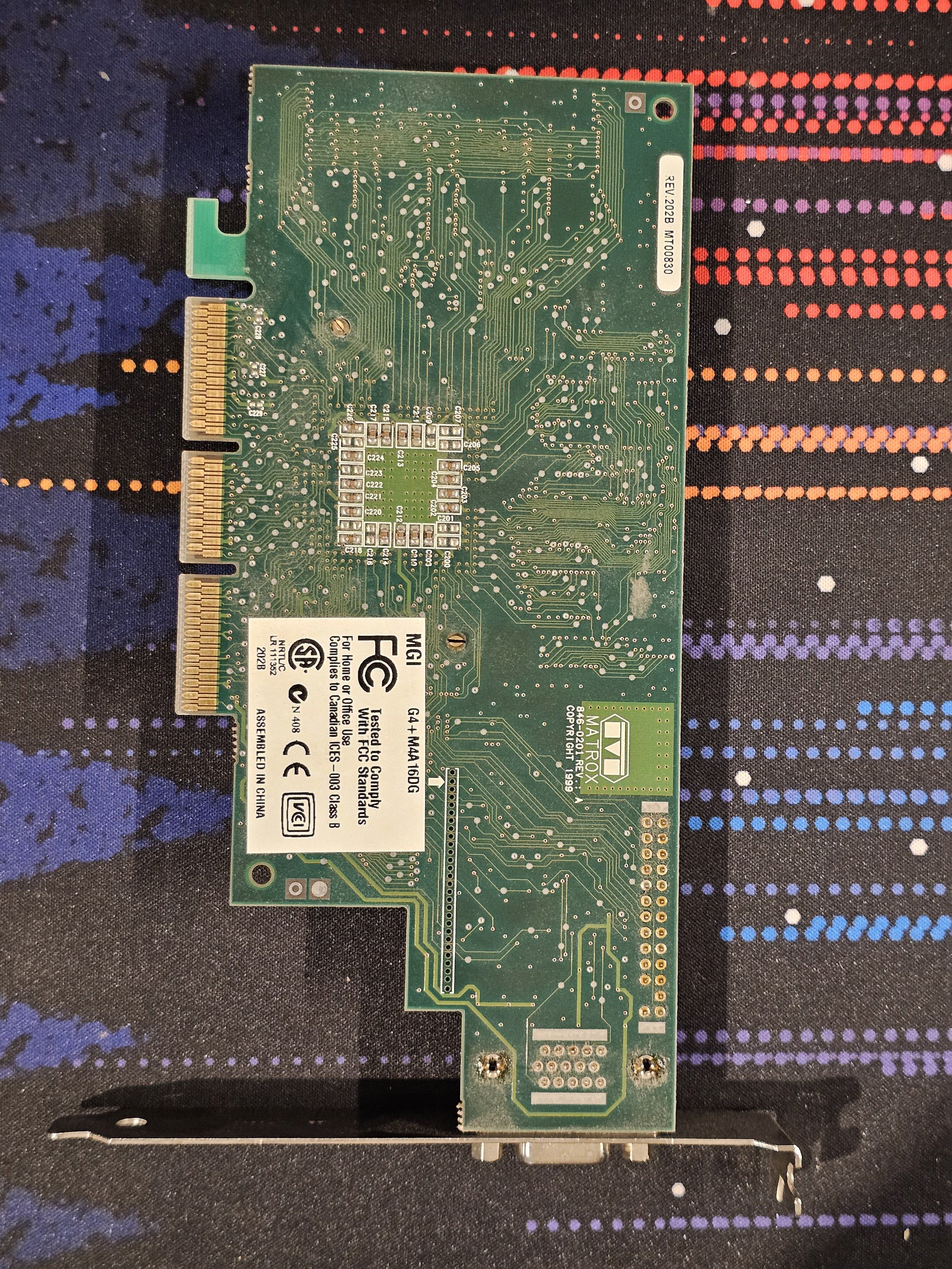 Habe eigentlich nicht erwartet in meiner Sammlung noch was für diesen Thread zu finden aber es geschehen doch noch Wunder. Beim Aufräumen ist mir eine unbekannte AGP Grafikkarte über den Weg gelaufen. Als ich "Matrox" auf dem PCB las war ich bereits mittelmäßig verwirrt. So eine Karte in meinem Besitz war mir gänzlich unbekannt. Aber nun gut, ab aufs Testbrett damit und geschaut was geht... Sie läuft. Eine Matrox Millenium G400 16MB SH. Für '99 wohl sogar eine halbwegs brauchbare GPU. Vielleicht schenke ich ihr irgendwann Mal einen P III Unterbau. Aber eigentlich ist das ein Stück Technologie knapp außerhalb meines Fokus. Man kann sich ja noch weiter entwickeln 😅