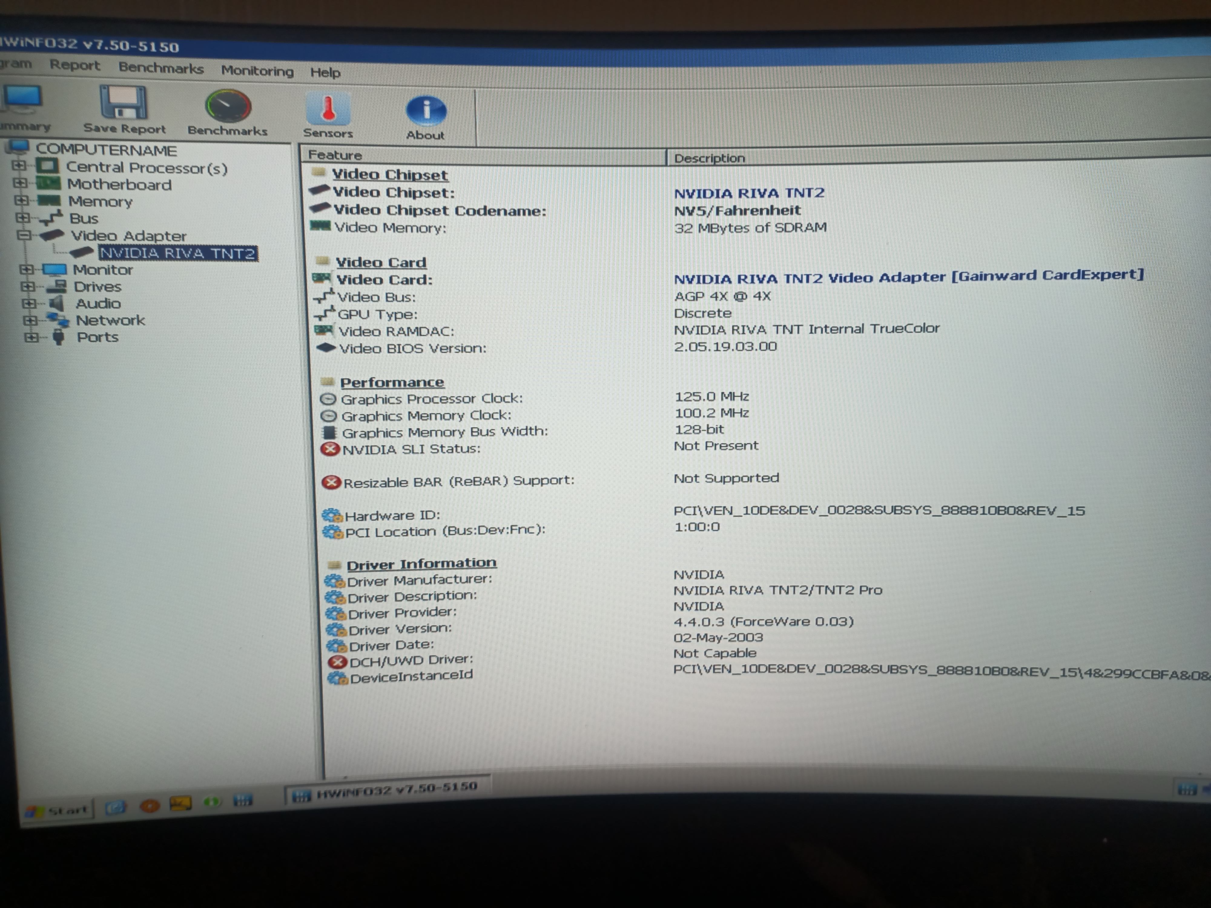 Hab eine sehr seltene Gainward Riva TNT2 (Pro?) ergattert. Sie hat auch das BIOS einer TNT2 Pro. Man findet im Netz gar nix zu diesem Modell. Scheint wohl eine Lite Version zu sein, deshalb auch der Aufkleber "TNT2 Pro-L /32M". Stutzig macht der 7ns RAM, denn eine echte TNT2 Pro bräuchte zumindest 6ns RAM für 166Mhz.