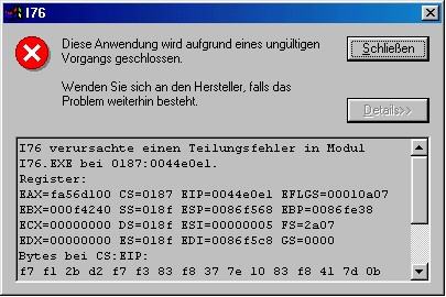 Lustigerweise mal so, mal so. Also es geht um die i76.exe aus der Interstate '76 Demo. Da kommt immer ein Teilungsfehler. Zum Mäusemelken. Hab jetzt sogar SIMMs versuchts anstatt DIMM, also EDO RAM. Und ne kleinere Festplatte. Ich führe die i76.exe 3x aus, dann kommt 3x "Sorry, die Datei kann nicht direkt ausgeführt werden" (dazu muss man wissen, dass diese Datei von einer "Launcher-Datei" ausgeführt wird) und dann führ ich sie noch 2x aus, dann kommt der 2x Teilungsfehler, beim 6. mal wieder "Sorry" beim 7., 8., 9., 10. wieder der Teilungsfehler und beliebig so weiter.