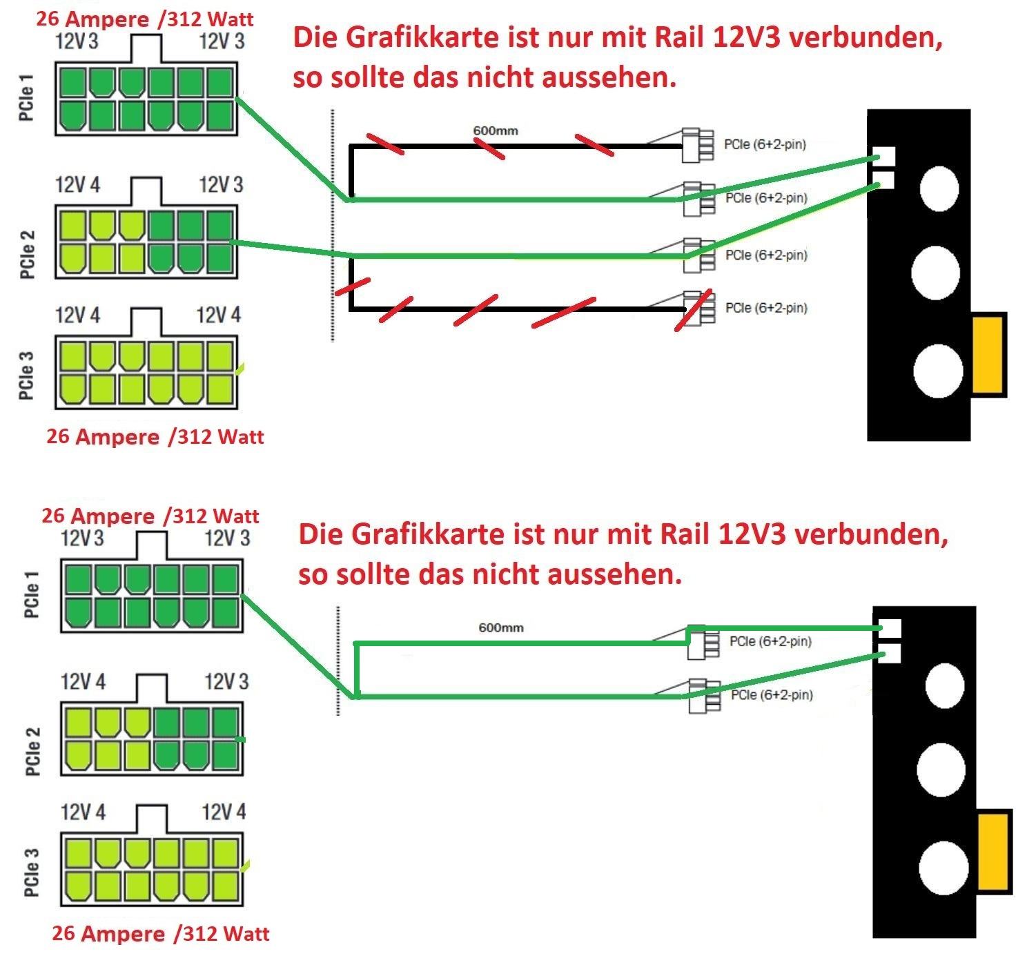 Die Grafikkarte ist auf jeden Fall falsch an das Netzteil angeschlossen, nur PCIe 1 mit Y Kabel.