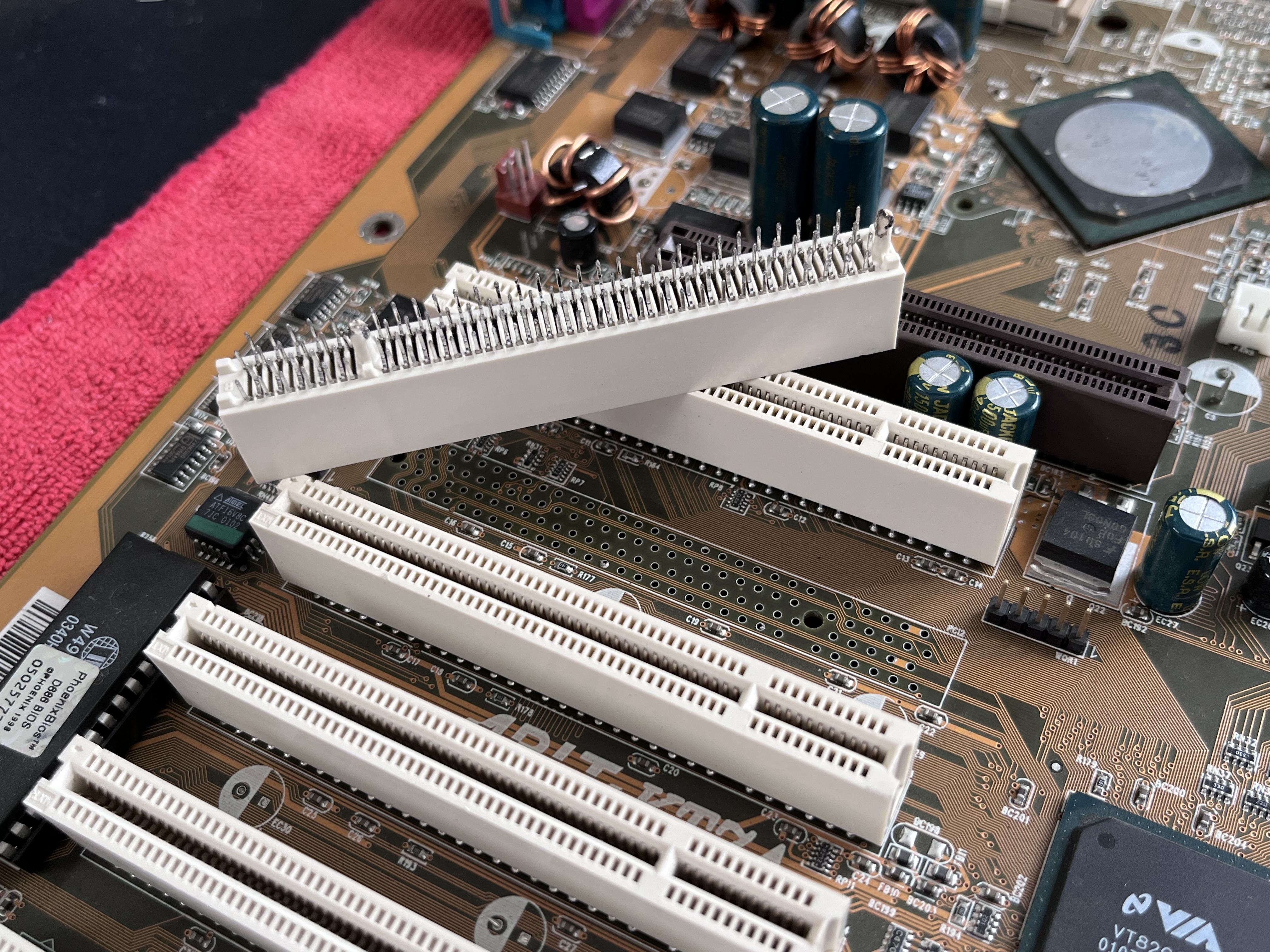 Dazu muss man sagen, es war einfach, weil der Slot ein wenig im Nirgendwo liegt. Wenn dann die Pins kleiner werden, (AGP, RAM, PCIe) haufenweise Kupfer und bleifreies Lot dazu kommt wirds später recht zäh.Ganz einfach mit meiner neuen Entlötstation. Ganz gemütlich, ohne Gewalt oder irgendweche Beschädigungen Punkt für Punkt aufgeschmolzen bis der Pin beweglich war und dann abgesaugt.