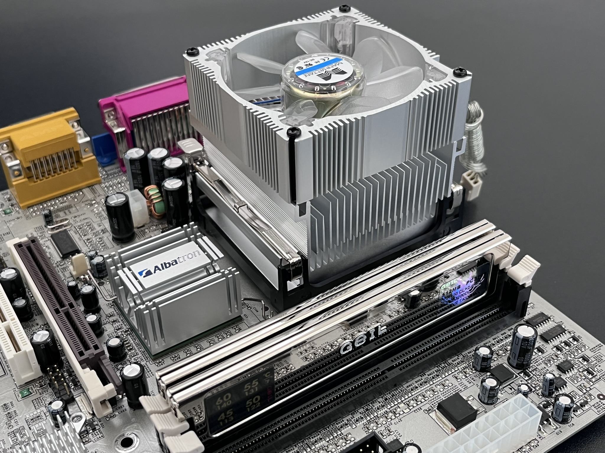 Nicht so leicht, weil der diese ätzende Drahtbügelhalterung hat.Bekommt man den Albatron NB Kühler 90° gedreht