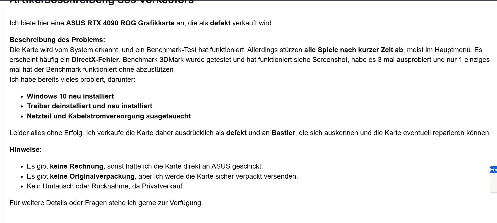 Ich habe kürzlich eine ASUS Strix 4090 gekauft. Sie machte optisch einen einwandfreien Eindruck, ließ sich auch installieren aber sobald man ein Spiel startet stürzt es ab. Selbst Minecraft und League Of Legends. Ich habe die Verbindung des PCIe-Slots und die Kabel natürlich mehrfach überprüft. Es ist ein 3 x 8 Pin-Adapter dabei, das Netzteil ist ein Seasonic Prime GX-1300.