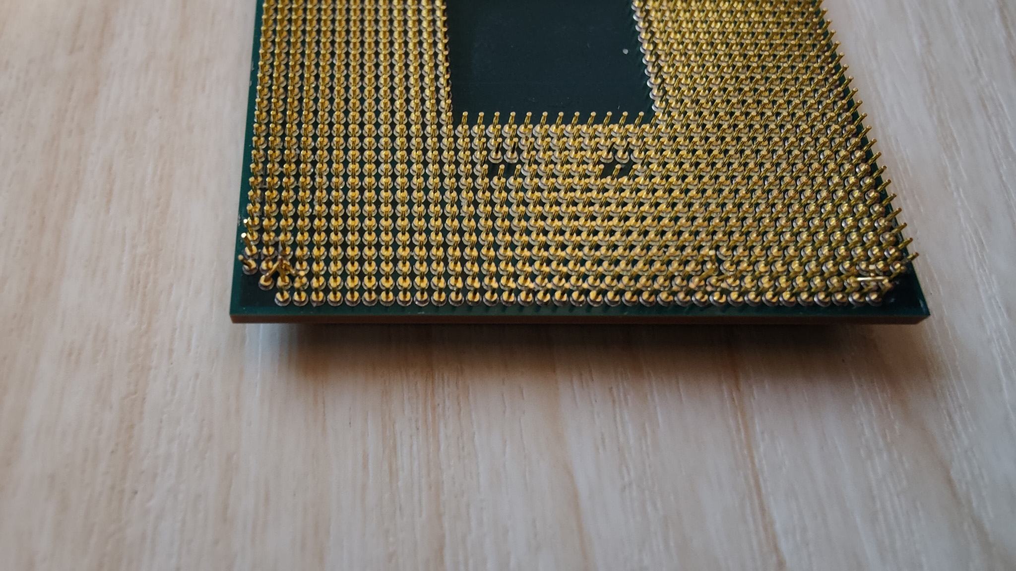 Beim Ausbauen meiner Ryzen CPU im NAS Server, um das Mainboard zu wechseln, blieb mir der Prozessor unbemerkt an der Unterseite des Wraith Prism Lüfters hängen. Erst als ich die beiden "Arme" des Lüfters befreit hatte und den Lüfter in der Hand hatte, merkte ich dass der Prozessor dranhing, und "etwas" Kontakt zum Sockel hatte. Resultat ist in den folgenden Fotos zu erkennen: