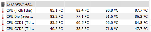 Also bei mir eskalieren die Temperaturen komplett. Beim the Witcher 3 spielen bin ich sehr schnell bei den 90°. CCD2 ist komischerweise viel kälter. Beim spielen nur etwa 60°. Und jetzt komplett seltsam: Nachdem ich mit dem spielen aufgehört habe und der Prozessor schon seit 20 Minuten bei ~5% Auslastung ist hab ich solche Temperaturen: