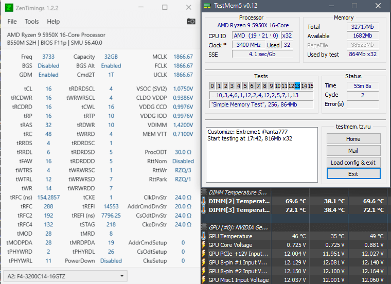 Für 3800 C14 brauch ich zu viel Saft, RAM ist nicht aktiv gekühlt. Hab mich dann über 3800 C15 GDM OFF 2T bis GDM OFF 1T hochgearbeitet.
