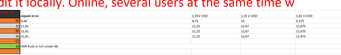 Ich habe nichts ausprobiert, weil ich mich nicht entscheiden konnte. Karhu sagt nur, dass ein Fehler vorliegt, aber wie bei TM5 gibt es keine Vorstellung davon, was der Fehler sein könnte. Sind es die VDD- und VSC-Spannungen, die Ihnen ins Auge fallen? Die Zeiten wurden gemäß der Excel-Tabelle angepasst. Ich habe vergessen zu erwähnen. Auch Memtest86 besteht den Test.