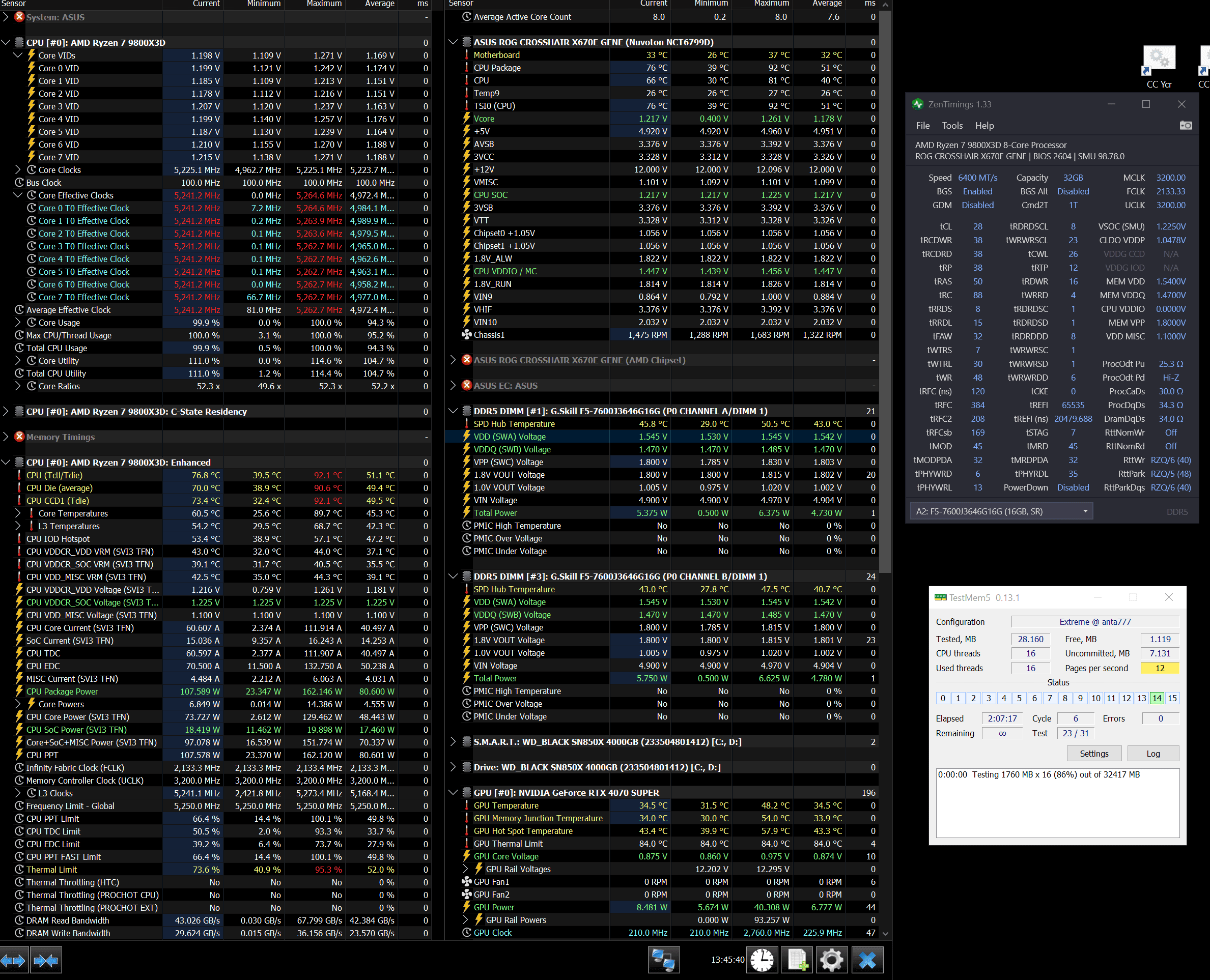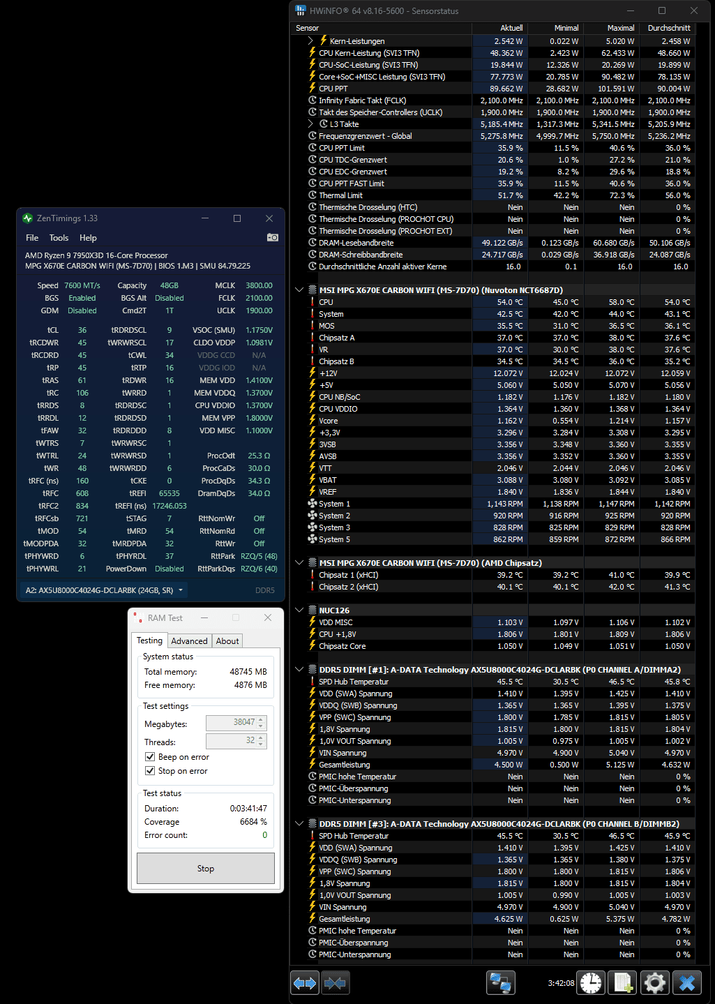 Temperatur sehen sehr gut aus ram max 62° läuft nun schon 40 Minuten ohne Fehler also 4*16gb auf 6000mhz wäre schon echt top denke ich