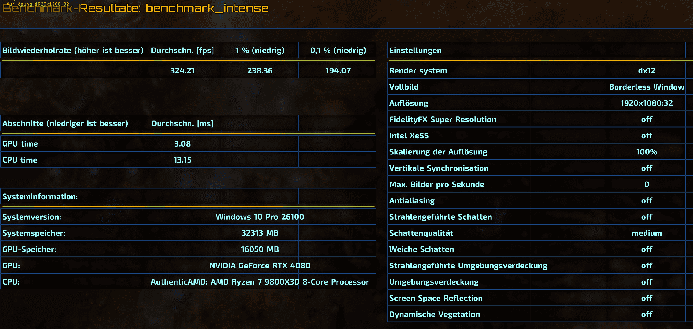 Für mich immer noch der beste RAM Test ist der Riftbreaker Benchmark (kostenlose Demo von Steam) mit diesen Einstellungen:kennt Ihr ein Game-Benchmark womit man am besten die Unterschiede zwischen Stock XMP und OC vergleichen kann, also in FPS-Leistung?