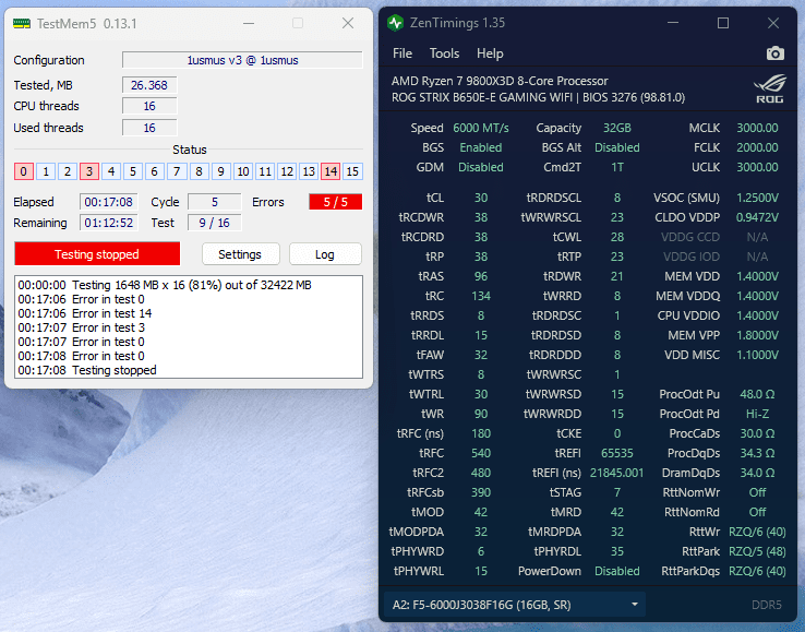 konnte die timings noch mal etwas drücken und mit der soc spannung runter. läuft auch durch das anta777 setting ohne fehler in tm5. allerdings wirft karhu bei ~5000% n Error.