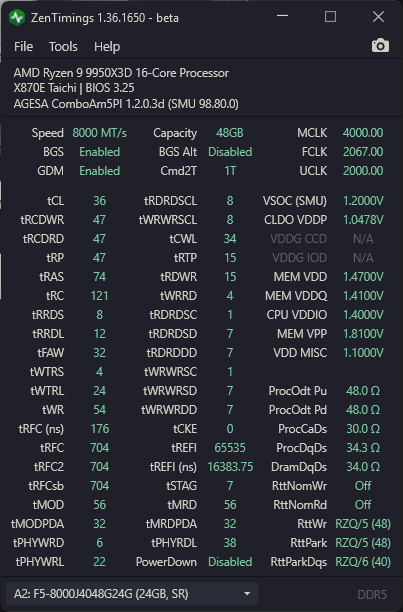Edit: Gerade gesehen, das müssten die aus dem Ryzen OC Discord sein "H 16M 6000 lasch zen4 SR". Nur tRFC und ProcOdt Pu weichen ab von der Empfehlung.