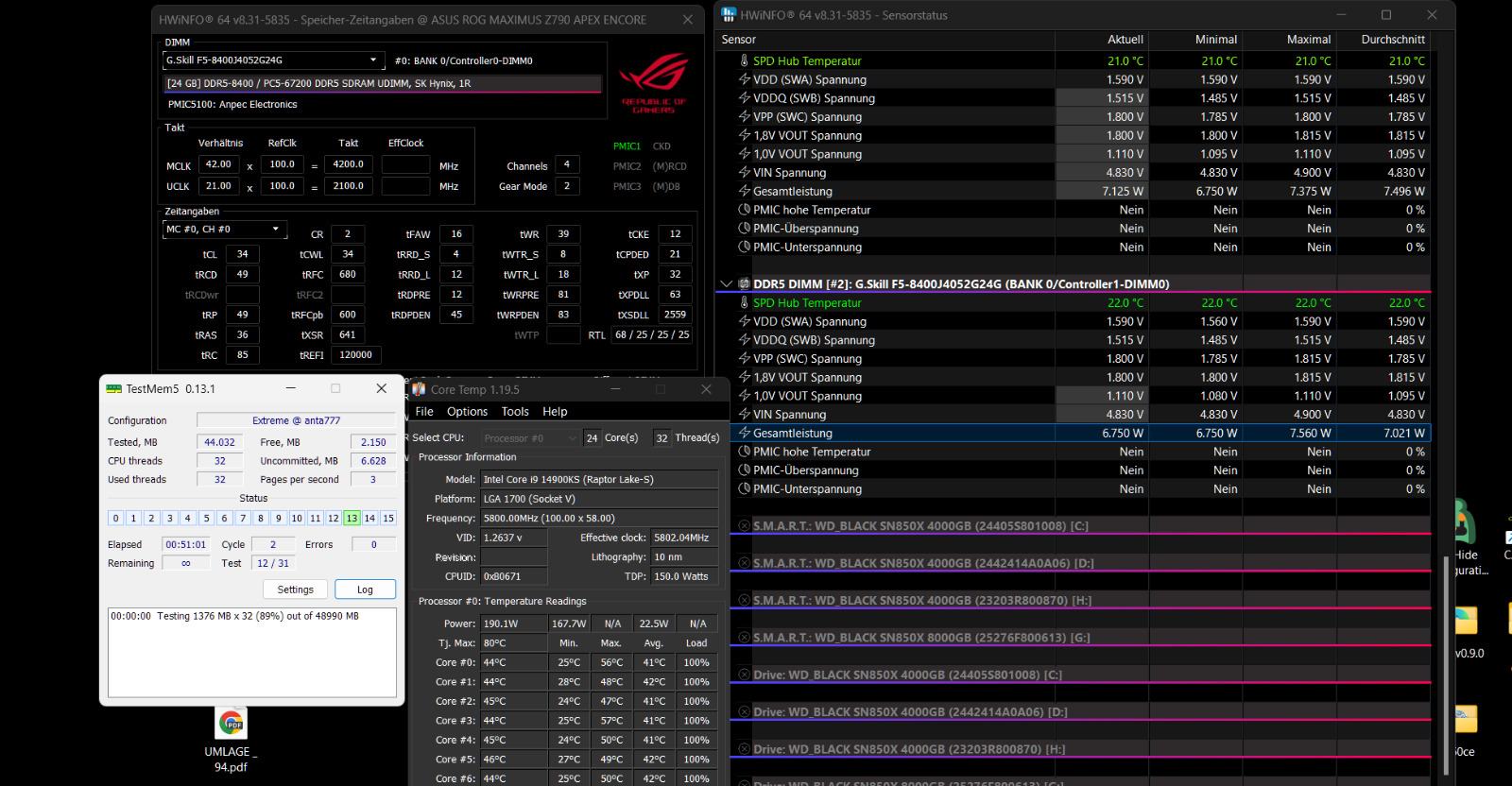 Also generell heißt es bei Signalqualität weniger ist meist mehr.Ich habe die Werte des Taichi vor geraumer Zeit mal versucht, soweit ich noch aus´m Kopf weiss, warens 8000 CL36 aber mit trfc 706 ; VDD 1,47 VDDQ ? VDDIO + VSOC ähnlich wie jetzt ; stdrd vddg vddp.