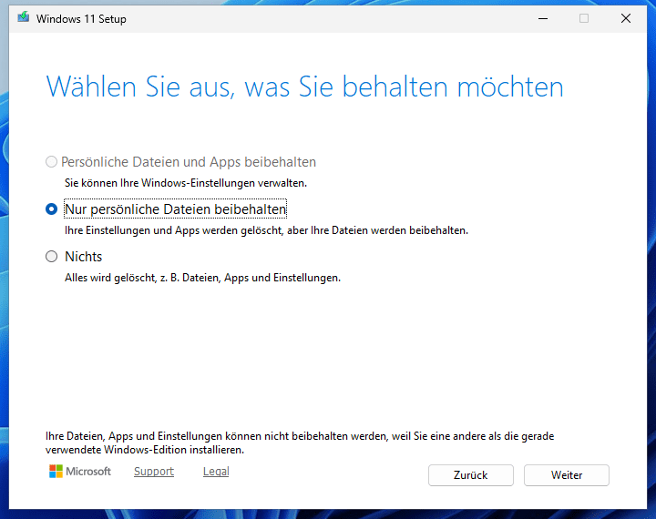 - Entscheide, ob du Daten und Apps behalten, nur Daten behalten oder eine Neuinstallation machen möchtest.