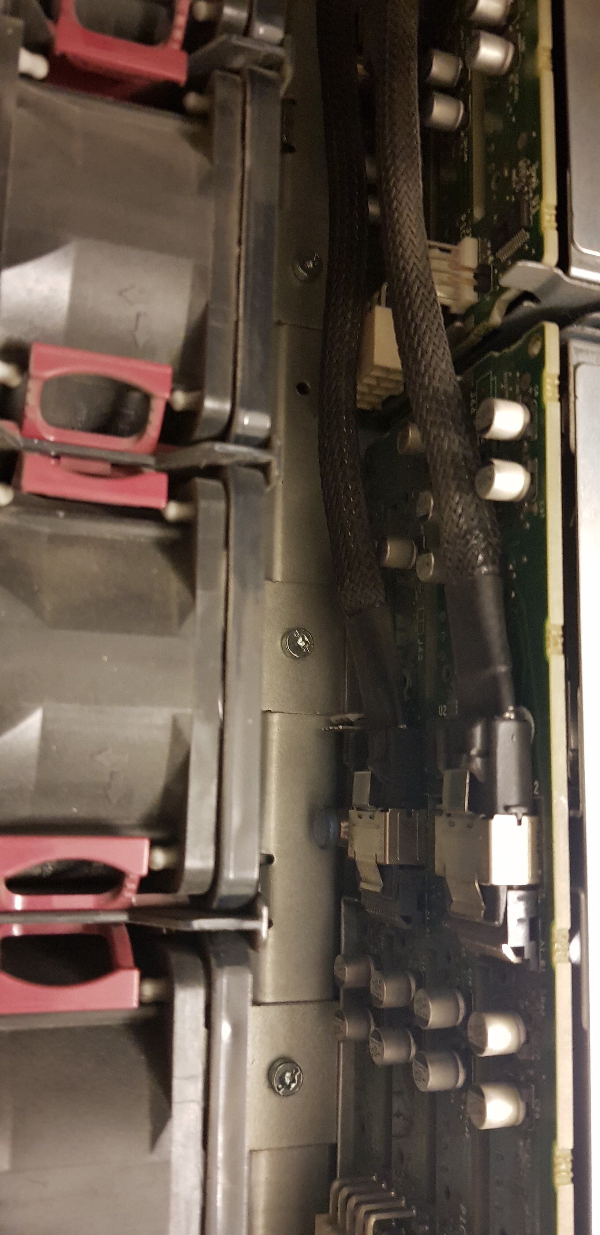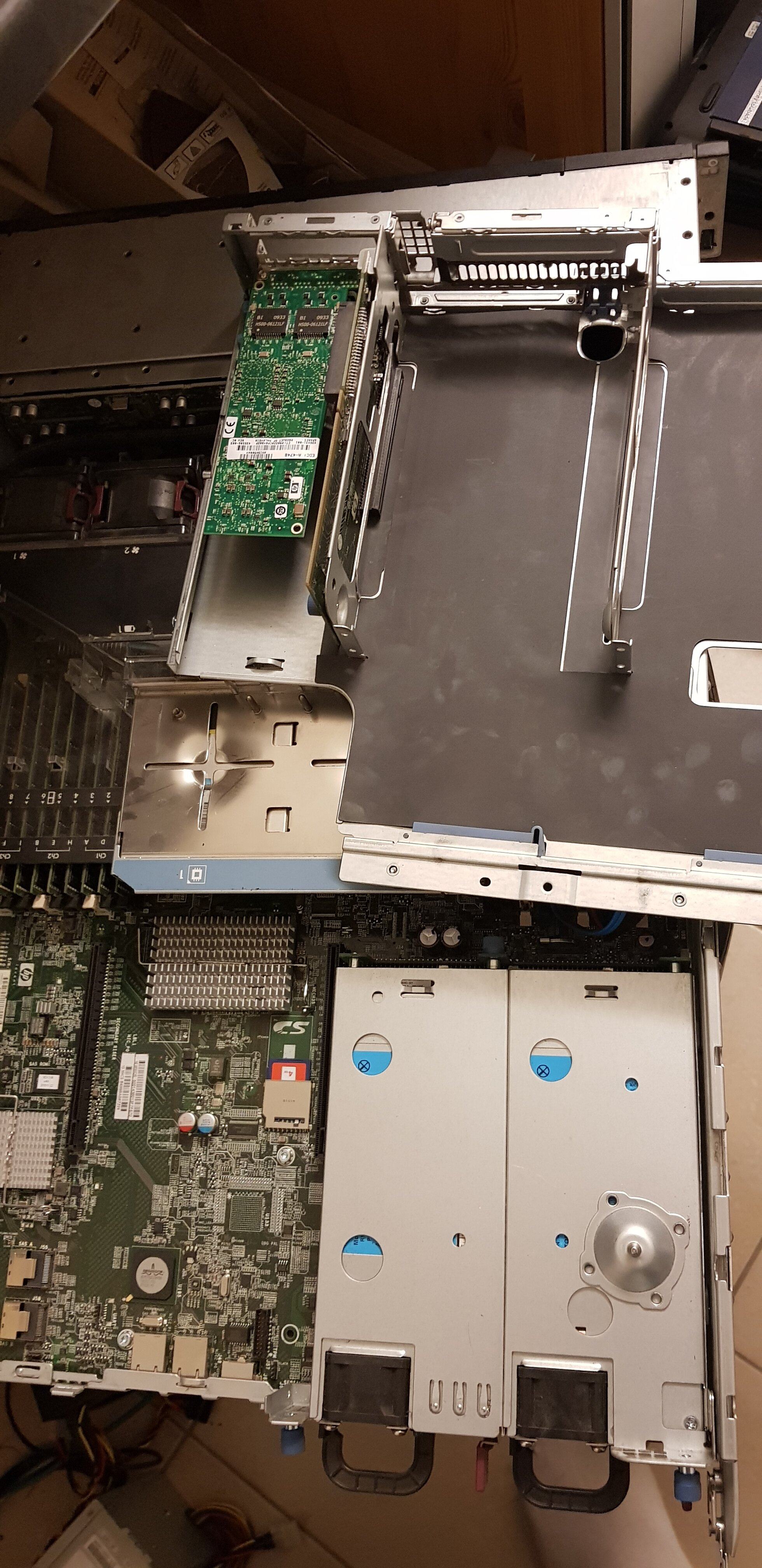 Das Gehäuse hat keinen Deckel und Wasserflecken von einer (oder vielen?) Nächten draußen. Ein Einschub ist drin, gegen Bares kann ich auch auf die vollen 8x 3,5" aufmunitionieren. Backplane mit 8 Einzelports drin und funktionsfähig. Board läuft, ein leicht angedellter Kühler ist vorhanden, die zweite CPU bräuchte halt einen (oder man zieht sie, das Board läuft auch halb bestückt). 3 Lüfter sind verbaut. RAM kann ich ein bisschen drüberstreuen, aber jetzt nicht die Welt. Beiden Gold-Netzteilen ist der Herausziehbügel abgeschlagen, alternativ ist auch ein 700W (ohne 80Plus-Aufkleber) mit Bügel da. Damals an einem Gossen Secutest gelaufen, also elektrisch keine Beanstandung.