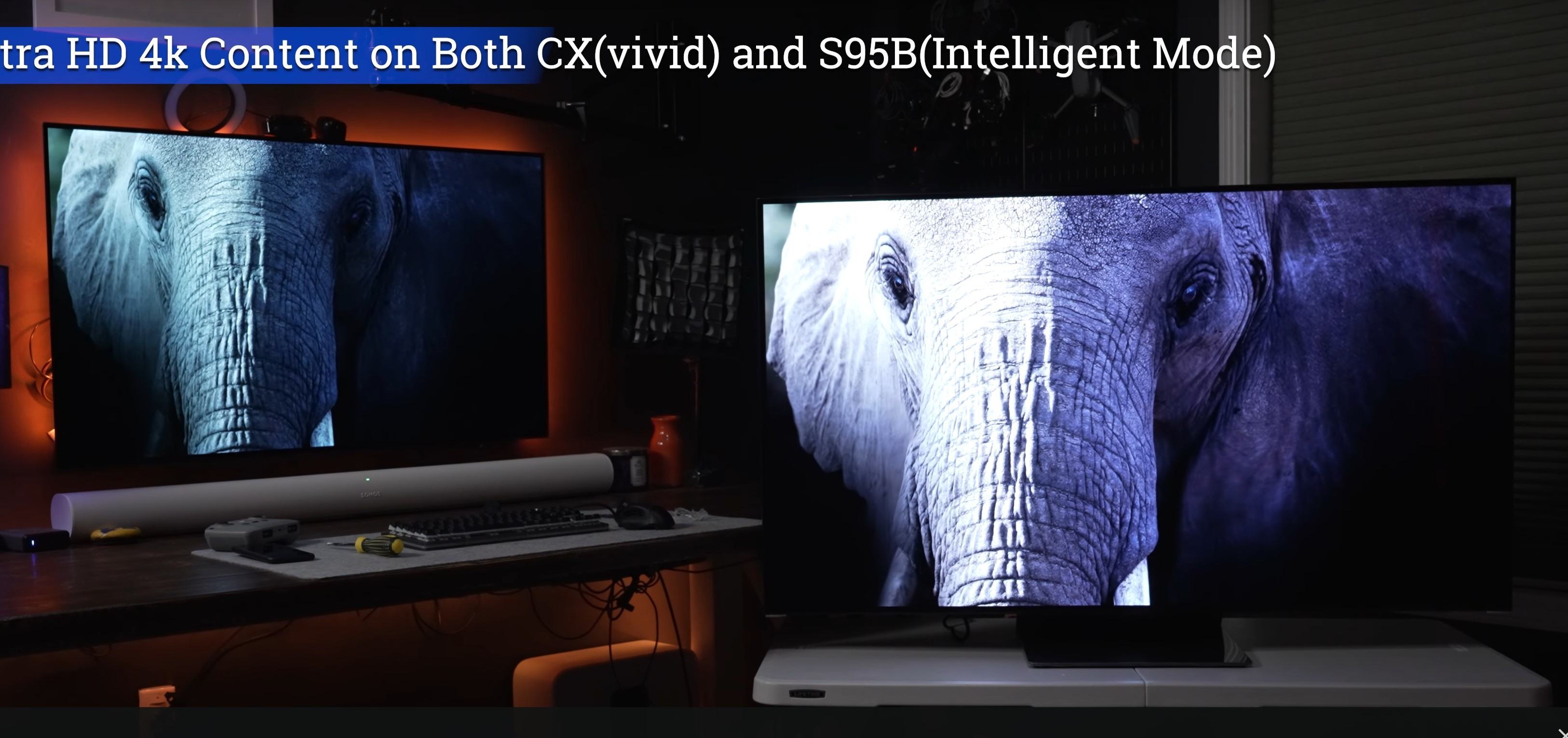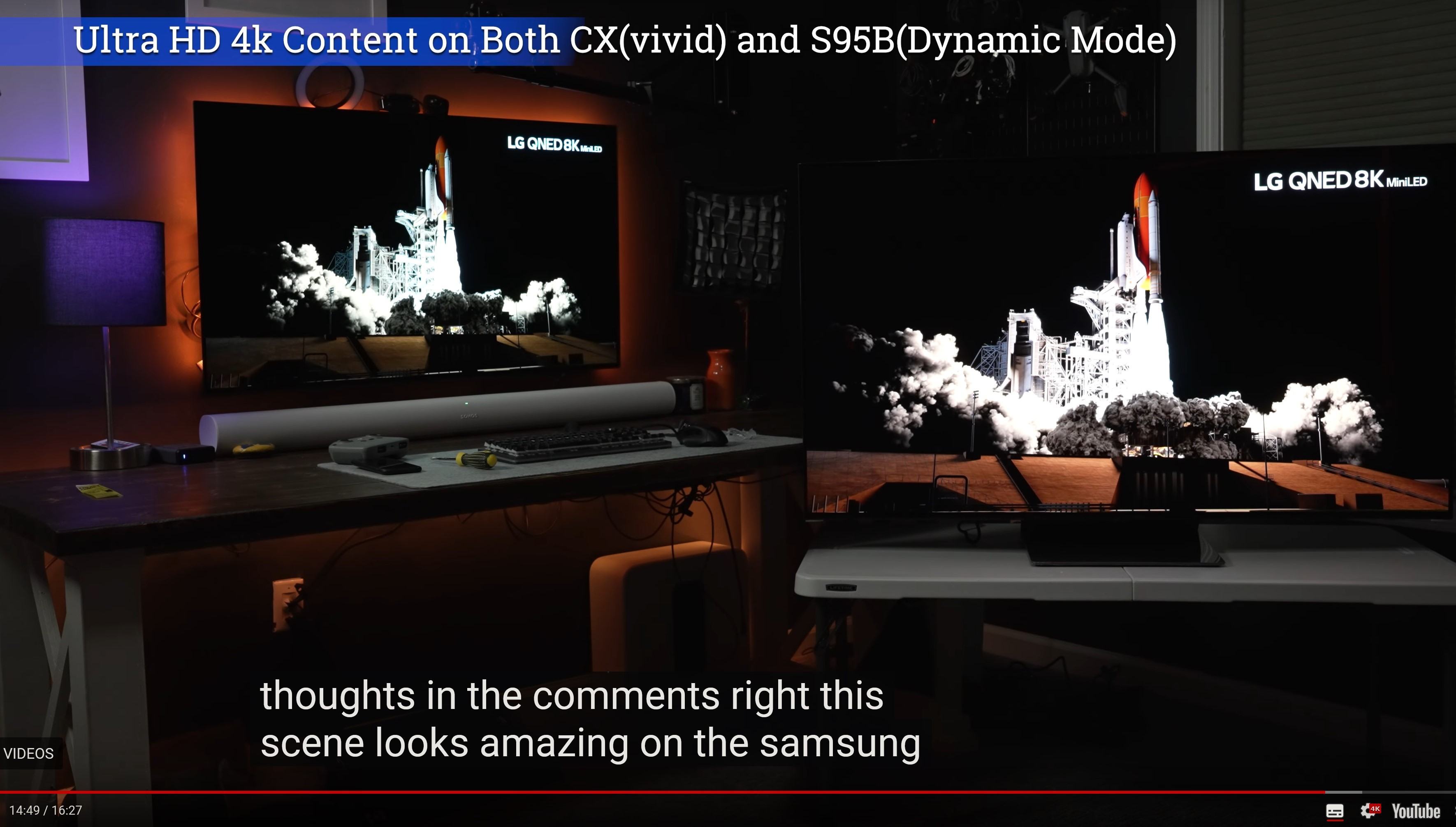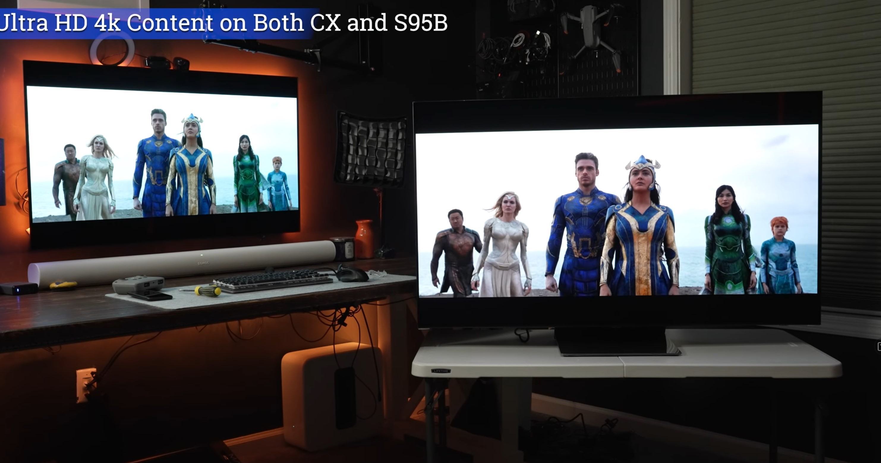 Jeweils Links ein 2020 LG WRGB OLED CX und jeweils Rechts der 2022 Samsung RGB S95B RGB QD OLED