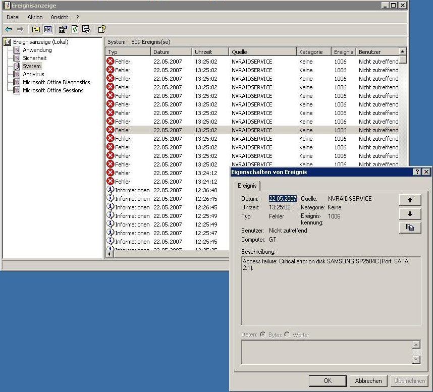 Heute nach 3 Wochen einwandfreiem Laufen erkenne ich im Ereignisprotokoll eine Fehlermeldung ..