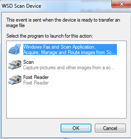 Nun ist es aber seit einer Weile so dass ich immer eine Auswahl bekomme ("WSD Scan Device" mit der "Window Fax and Scann App", "Scan" und "Foxit Reader". D.h. jedes mal wenn ich ein Dokument scanne, muss ich das Programm bestätigen, mit welchem der Vorgang ausgeführt werden soll. Ist relativ blöd wenn der PC etwas weiter weg steht vom Scanner.