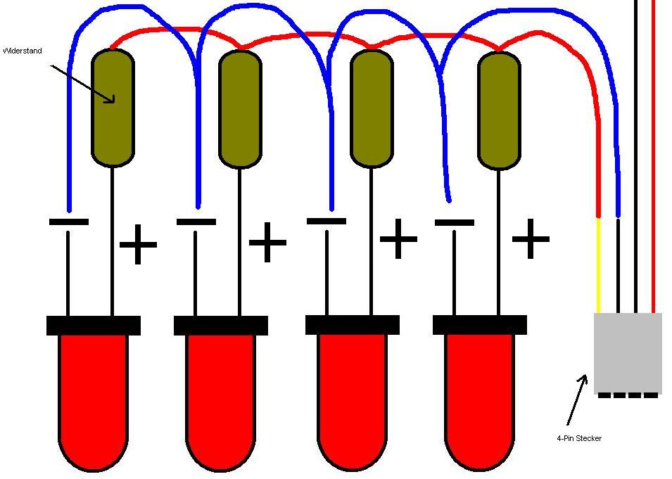 genau, und teste es halt mal mit 4, wenns nicht genug leuchtet, ist die andre möglichkeit nur 3 und statt der 4. nen widerstand zu nehmen. der ist dann kleiner als der widerstand der 4., und damit bekommen die 3 andren mehr spannung ab, also heller wenns nicht mit 3 v geht.