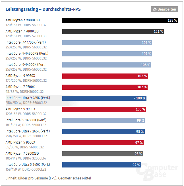 Ein 9800X3D liefert 38% mehr Leistung und selbst der i7 Vorgänger für 450€ liegt 7% vor dem 700€ Core 285k. Das als marginal langsamer zu bezeichnen ist lächerlich.