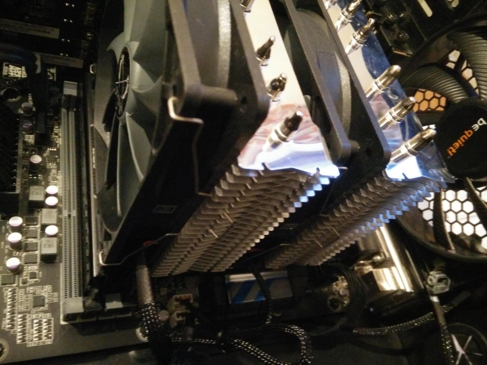 Zur Kompatibilität ist zu sagen dass der Kühler durchaus niedrig angesetzt ist, also die Kühllamellen sehr tief sitzen und so die Montage des Lüfters etwas schwierig sein kann. In meinem System liegt der vordere Lüfter jetzt auf meinem ersten RAM-Riegel auf und sitzt somit nicht in der Mitte (von der Höhe her) des Kühlers. Eine zweite Option wäre es gewesen den zweiten Lüfter hinten, also saugend zu montieren.