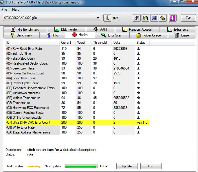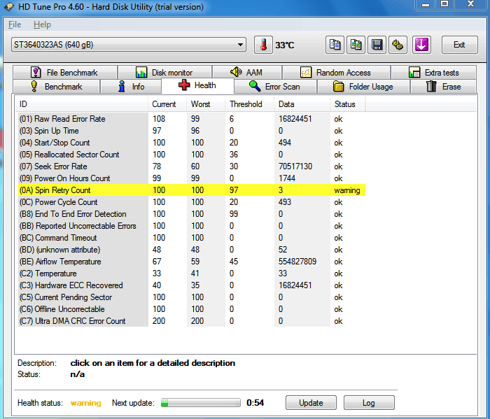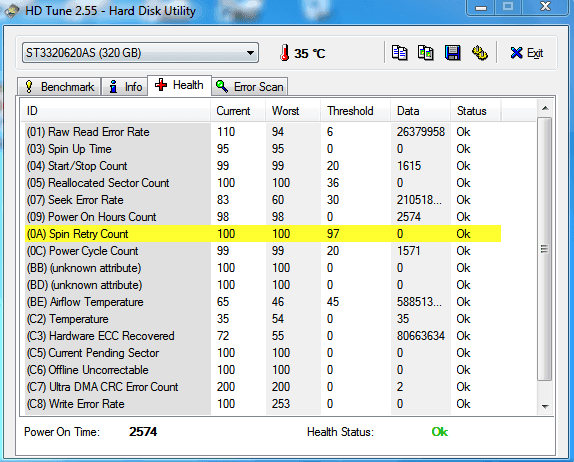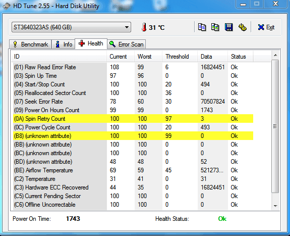 Hallo,schaut euch mal die Bilder an und sagt mir was ihr davon haltet.Seatools und Cristaldisk meinen alles O.K.HD Tune zeigt mir bei den Festplatten gelbe Felder an.Muss man sich da irgendwie sorgen machen und was bedeutet Spin Retry Count ???
