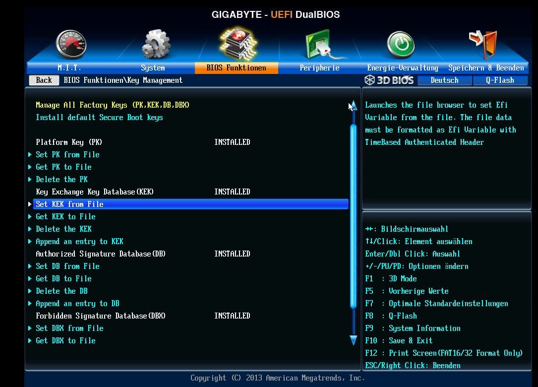 Also, folgendes Problem: Es gelingt mir einfach nicht, im BIOS Secure Boot zu aktivieren. Eingeschaltet ist es wie im Bild zu sehen, aber aktiv ist es trotzdem nicht. Ich denke, das dort irgendeine Einstellung nicht passt, aber keine Ahnung welche. Es könnte durchaus auch mit dem User Mode zusammenhängen, aber ich bin mit meinem Latein erstmal am Ende. Habe mal Bilder gemacht; Brett wäre ein Gigabyte GA-Z77MX-D3H TH (Rev. 1.0). Vllt hat jemand so ein Brett und weiß aus dem Stehgreif die Lösung....
