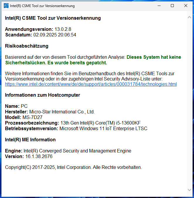 Ob deine ME aktuell und safe ist kannst du mit den Intel CSME Tool prüfen. Grüner Text: alles gut | Roter Text: solltest dringend die ME updaten!