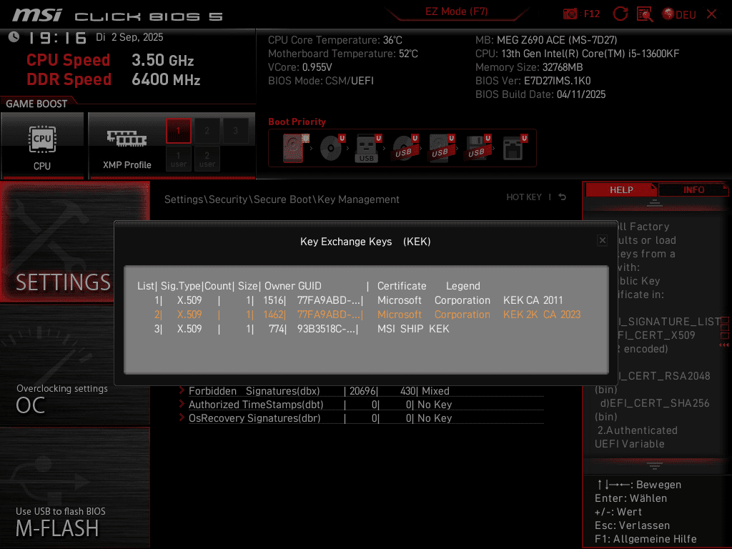 Settings -> Security -> Secure Boot: Dort den Secure Boot Mode von "Standard" auf "Custom" stellen.