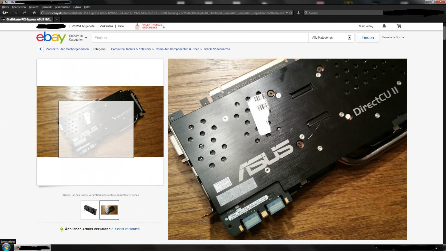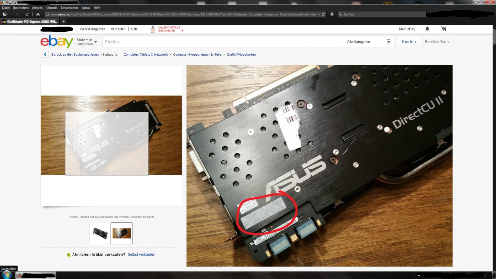 Und zwar ist mir aufgefallen das ich seit erwerb meiner Asus Strix GTX 970 keinen Seriennummernaufkleber hinten auf der Karte habe. Kürzlich wollte ich die Asus Strix 970 Umtauschen wegen der Sache mit dem Speicher, ok Karte zum Verkäufer geschickt, und nun sagt der zu mir "Es ist keine Seriennummer auf der Karte vorhanden", und schickt mir Karte wieder zurück. Dummerweise schau ich heute bei ebay nach Asus Strix GTX 970, und siehe da es ich finde Bilder wo ebenfalls keine Seriennummer hinten auf der Karte ist, der Aufkleber fehlt nicht ganz sondern ist nur zur Hälfte abgelöst, genau wie bei mir.