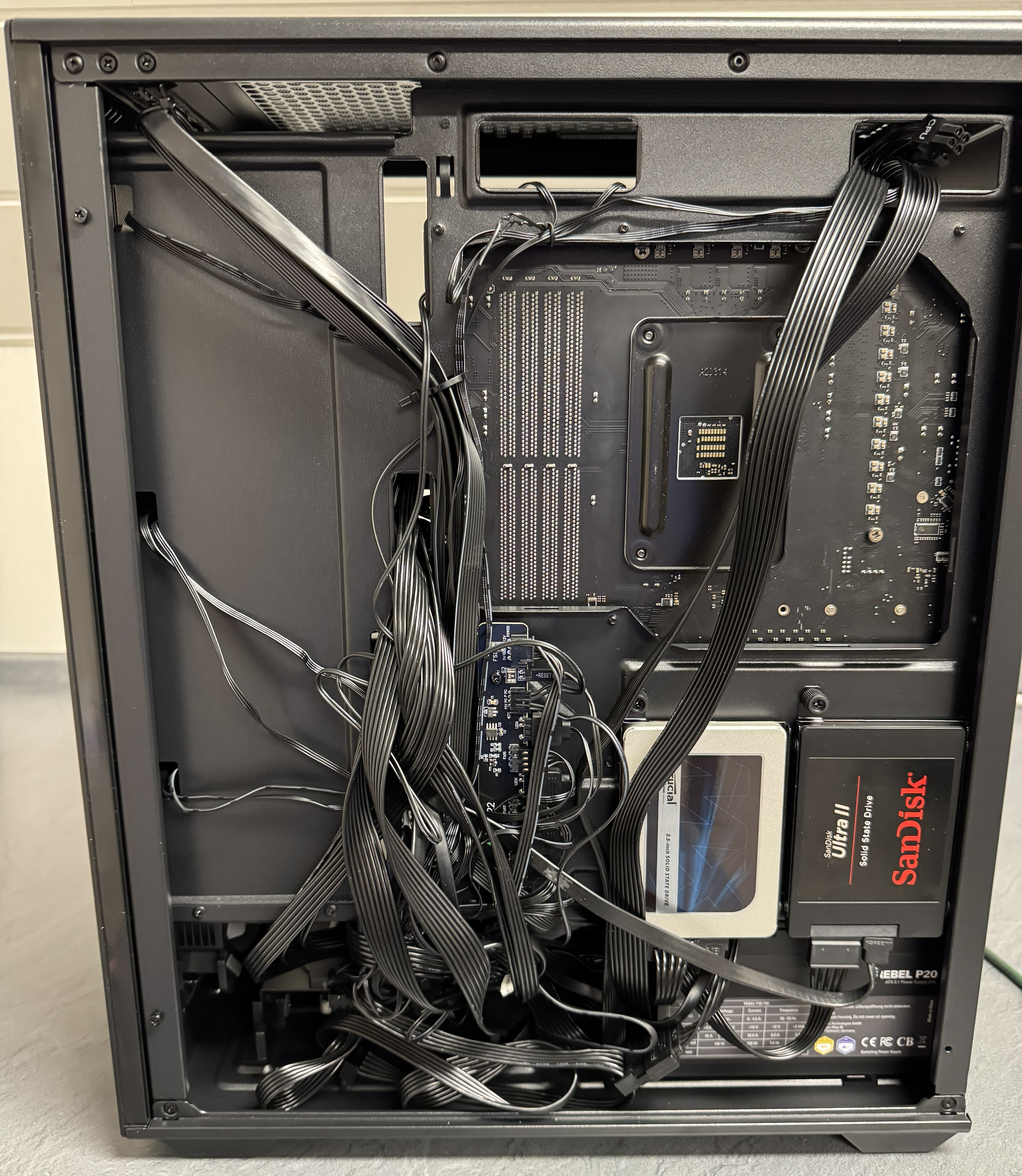 Kabelmanagement in diesem Gehäuse ist machbar, macht aber keinen Spaß. Es gibt keine wirklichen Verzurrpunkte oder Führungen. Zudem gibt es das Problem, dass der Abstand zur Gehäusewand sehr schmal ist. Dickere Kabel verursachen massive Probleme.