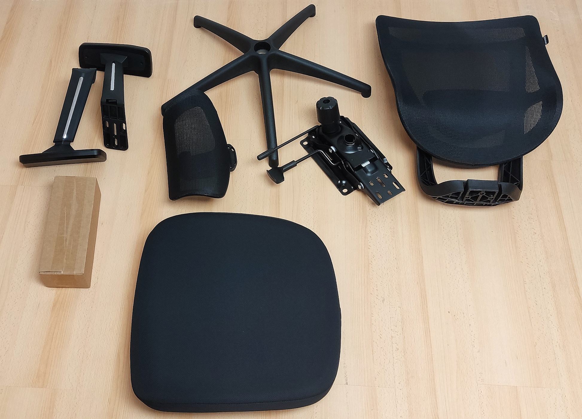 Die Teile ausgepackt, erkennt man direkt das die meisten Teile nicht aus Metall bestehen. Neben den Gewindeeinsätzen die Gasdruckfeder, der Unterbau und ein kleiner konischer Einsatz für die Gasdruckfeder im Fußkreuz. Der Rest besteht zum Großteil aus Nylon und Netz. Im ersten Moment ist das ungewohnt und vermittelt evtl. nicht die Stabilität, die man schlussendlich erwartet.