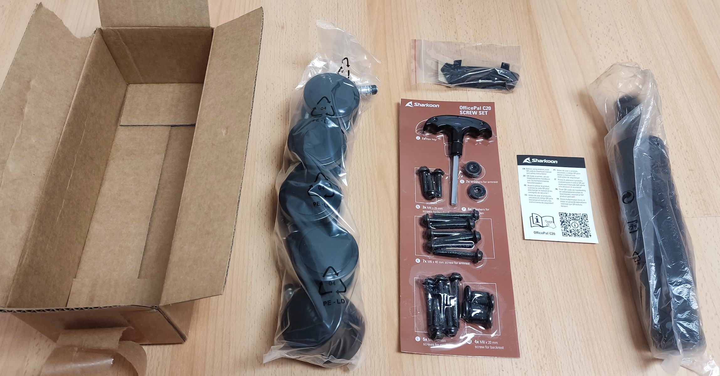 Diesen geöffnet findet ihr alle Schrauben, ein Werkzeug mit ergonomischem Griff, die Gasdruckfeder und die Rolle. Sowie eine kleine Blende mit dem Sharkoon Logo.