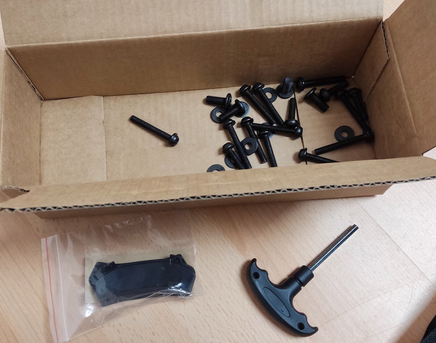 So schön es ist, dass man direkt alle Schrauben im Überblick hat, so nervig sind diese Verpackungen zu öffnen 😉 Nunja, der Innensechskant liegt dank dem Griff sehr angenehm in der Hand womit der Aufbau deutlich leichter von der Hand geht. Alle Schrauben in den Karton geworfen, fällt auf das die meisten Schrauben etwas billig wirken und Rissen aufweisen.