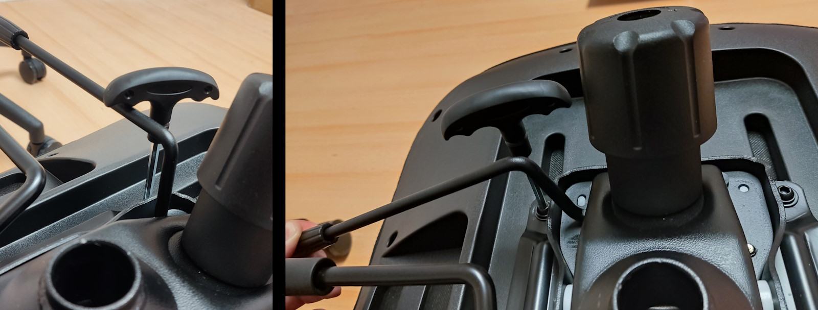 Beim Verschrauben des Sitzpolsters sowie den Armlehnen und Rückenlehnen konnte ich keine Probleme feststellen. Weder gab irgendeine Schraube oder Gewindeeinsatz nach, noch war ich irgendwann zaghaft beim Anziehen. Der Stuhl wird ständig in Bewegung sein, daher sollten die Schrauben schon gut handfest angezogen sein. Vorsicht! Bei Nutzung von eigenem Werkzeug auf die Hebelwirkung achten. Der Hersteller will zwar sicherstellen, dass ein Werkzeug für den Aufbau vorhanden ist, aber mit dem mitgelieferten Werkzeug kann ebenfalls auch die ausgeübte Kraft auf die Schrauben „definiert“ werden.