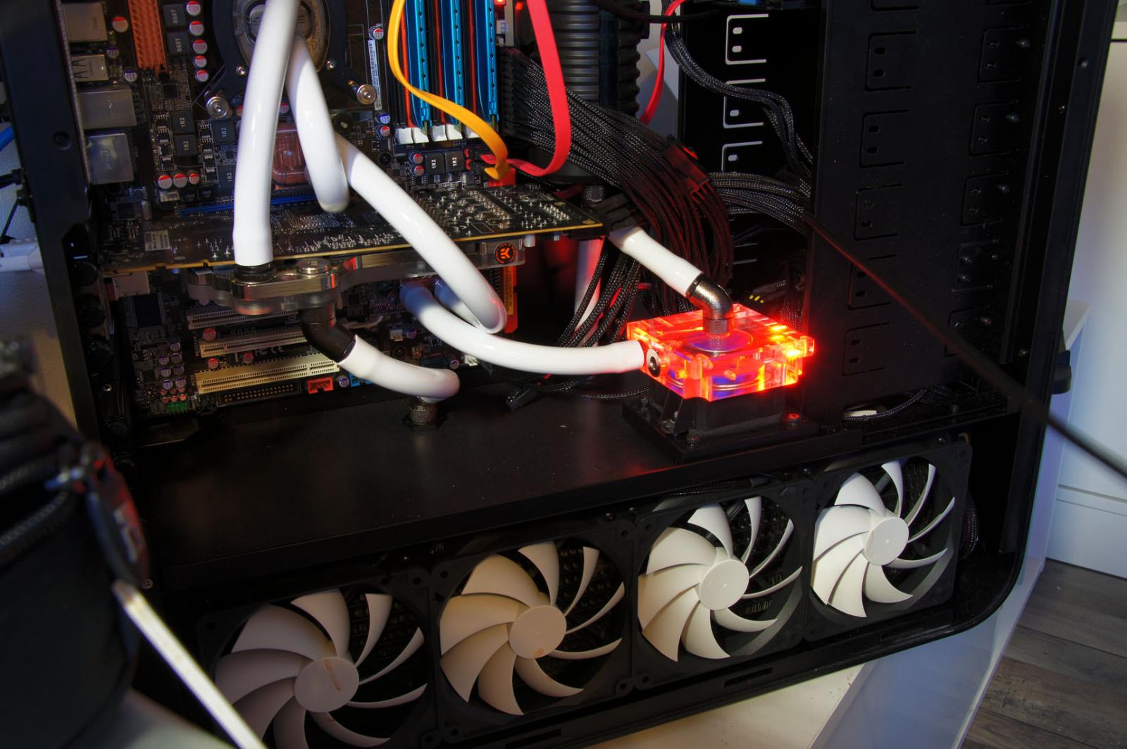 Also ich finde, dass man die Pumpe nicht unbedingt unten reinpacken muss, sie macht auf der Midplate eigentlich auch was her.