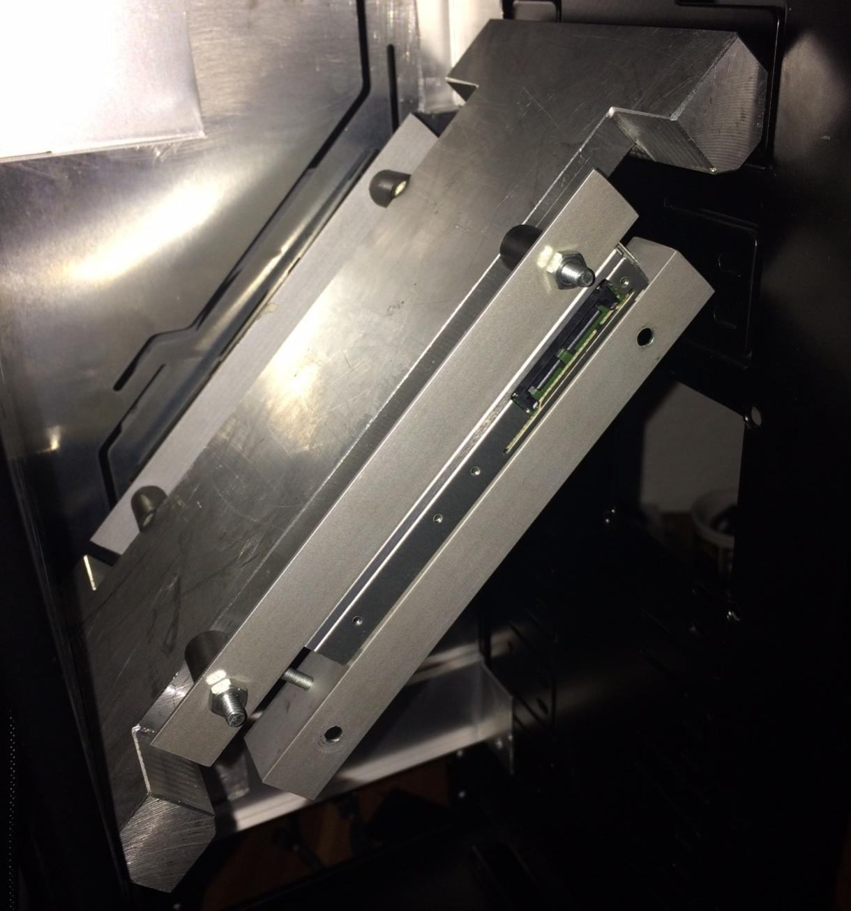 Die Frontplate ist Drahterodiert und für das Laufwerk habe ich aus Aluminium eine Halterung angefertigt. das Laufwerk wird Quasi zwischen den Alu-Winkeln geklemmt.