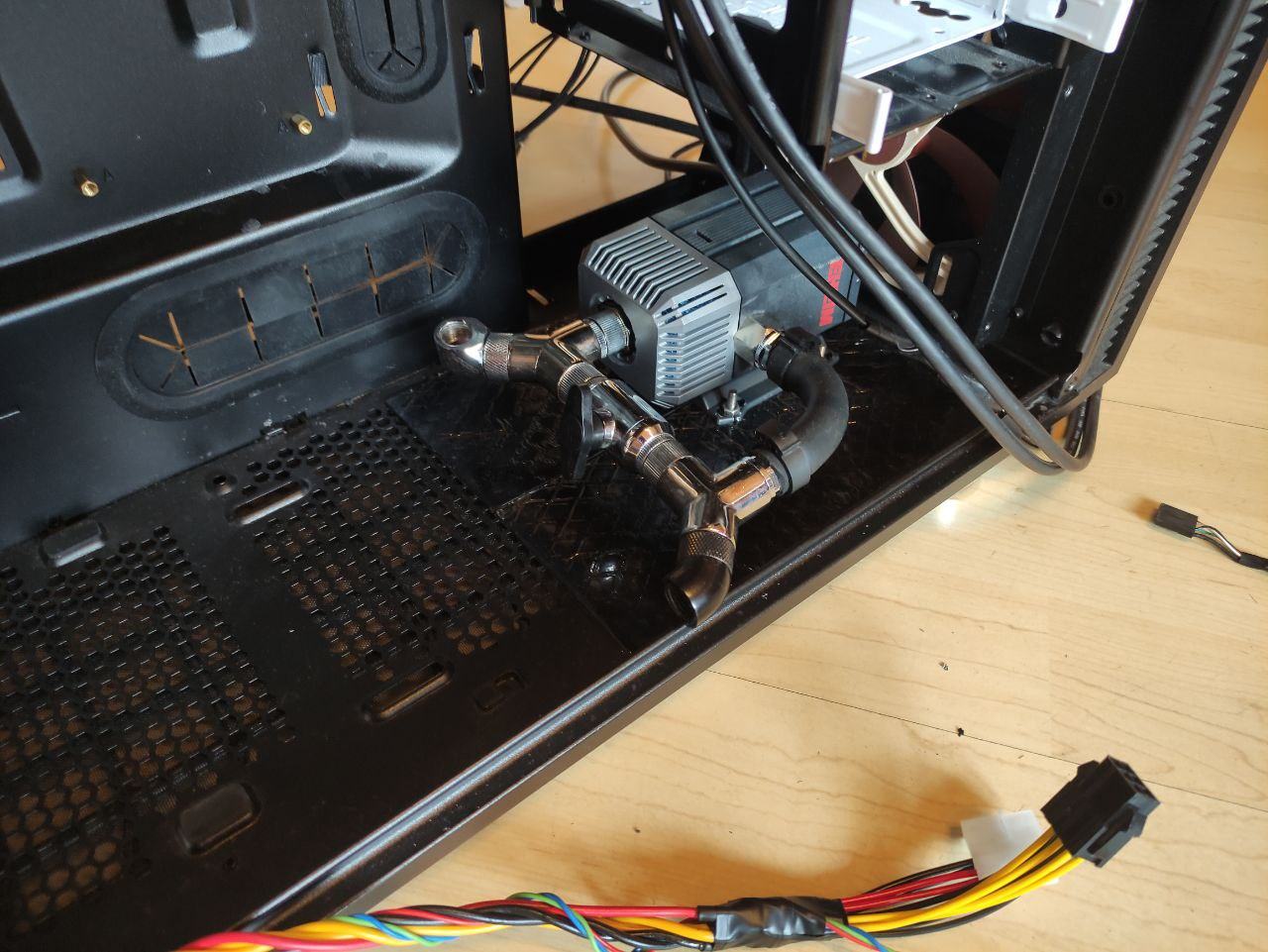 Unten hinten kommt eine alte 230V-Eheim. Die hat den simplen Grund, dass ich den PC transportabel halten will. Da Transportabilität, Metalldeckel und Entkopplung nicht zusammenpassen, muss es eben eine Pumpe sein, die einfach ein- und auszuschalten ist. In dem Fall liegt das Stromkabel nach außen und ich muss nur den Stecker ziehen. Da eine alte Eheim einen gewissen Widerstand darstellt, ist sie mit einem Kugelhahn leicht überbrückbar, wenn man sie nicht braucht.