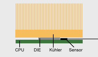 Dann einen Fühler direkt an der CPU ( DIE ) angebracht,aber so das der Fühler ganz nah anliegt,und das der Fühler kontackt mit dem Kühlerboden hat !