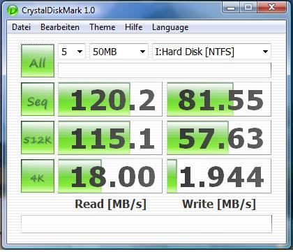 bekomme da 124,8 seq. leserate und 76,72 seq. schreibrate raus, 512kb sinds: 104,9/0,773 und 4k sinds 18,27/0,960