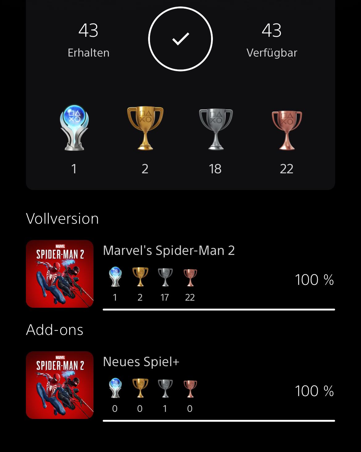 Stimmt, bei Spider-Man 2 brauchte man es nicht für Platin.Für Platin? Da habe ich zumindest bei Spider-Man 2 NICHT 2x die Story gespielt. Bei Miles Morales konnte man die New Game+ Story dann durchrushen, das konnte man in 4-5 schaffen.