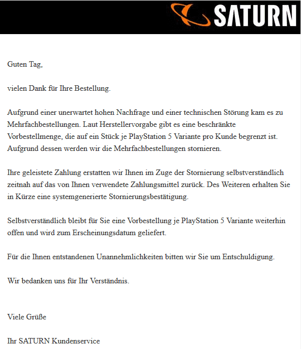 In anderen Foren heulen die ersten auch schon rum, weil MM ihnen ihre 4 vorbestelten PS5 storniert haben udn sie nun leider keine Leute bei ebay abzocken können haha da kullern gerade mächtig die Tränen.....also ich finds gut :P