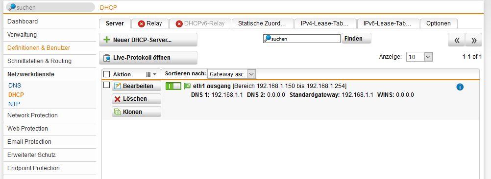 Sophos eth1 ausgang hat die ip 192.168.1.1!