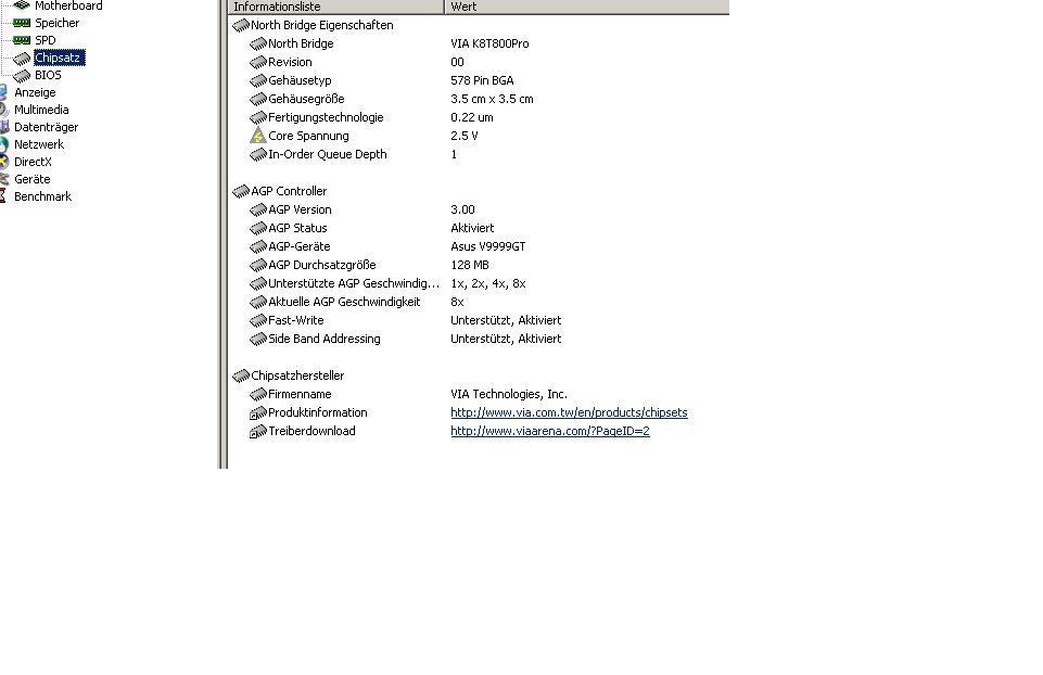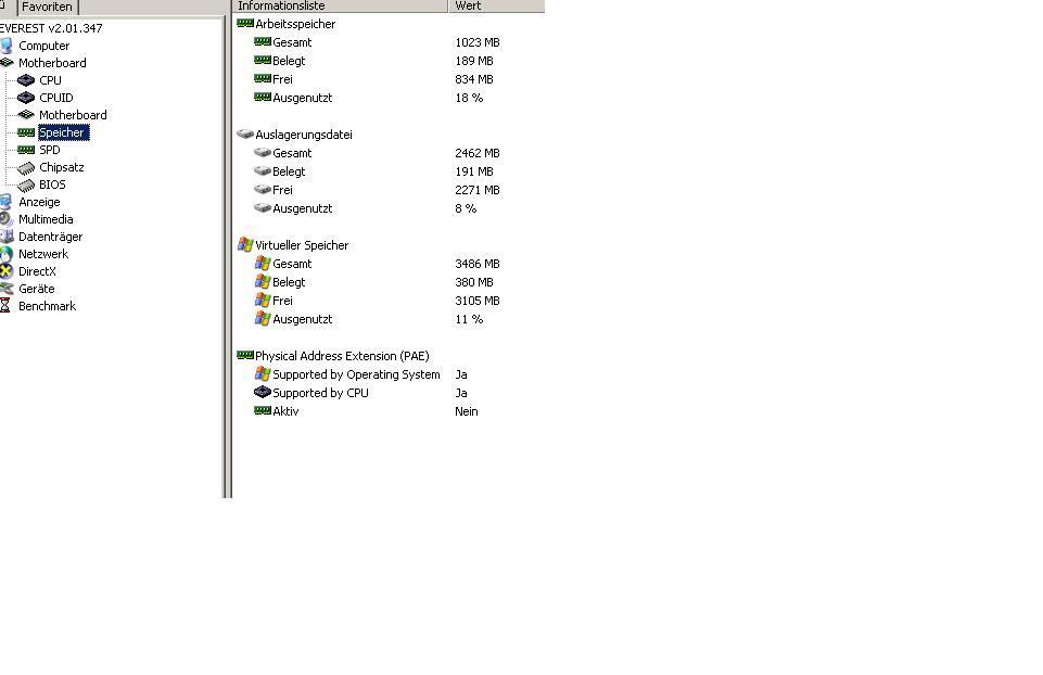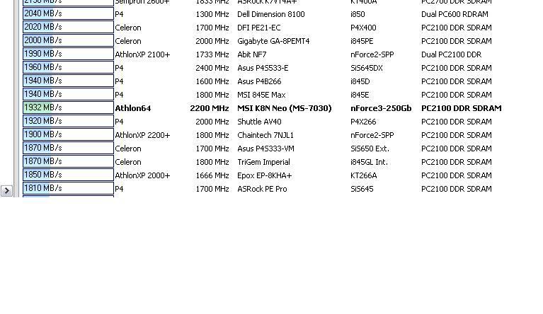 Ich glaube, ich habe da ein Problem... Gerade hab ich mir mal Everest gezogen. Dann hab ich mal den Benchmarktest durchlaufen lassen, und bin ein bisschen enttäuscht. Mit meinem System erreicher ich nur 1912 MB/s, obwohl das eigentlich mehr sein müssten. In der letzten Spalte, wo die Infos zum Speicher stehen, zeigt das Prögramm an, dass ich nur einen PC 2100 Ram hätte. Jedoch bin ich mir ziemlich sicher, dass ich zwei 512er Module von Infineon mit 400 MHz habe, also PC3200! Also: Wie kann ich den Speicher richtig einstellen übers BIOS oder sonstiges? Erfahrung hab ich damit keineswegs.