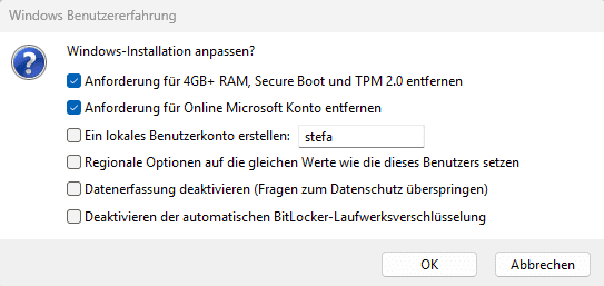 Beide Haken raus weil dein PC (Motherboard) hat TPM und auch möchtest du dich mit deinem Microsoft Konto anmelden.