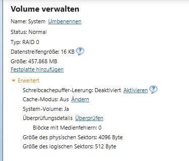 Das Raid ist über den Intel Controller eingerichtet worden und hat eine Stripe Size von 16 KB (Standardeinstellung und Empfehlung von Intel für SSD Raids)