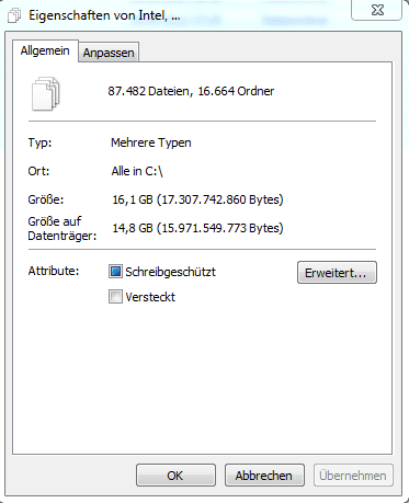 Ausgeblendete Systemordner habe ich angezeigt und dann alle markiert ->rechte Maustaste->Eigenschaften und da sieht man dass alle Datein auf der SSD nur 16GB belegen.