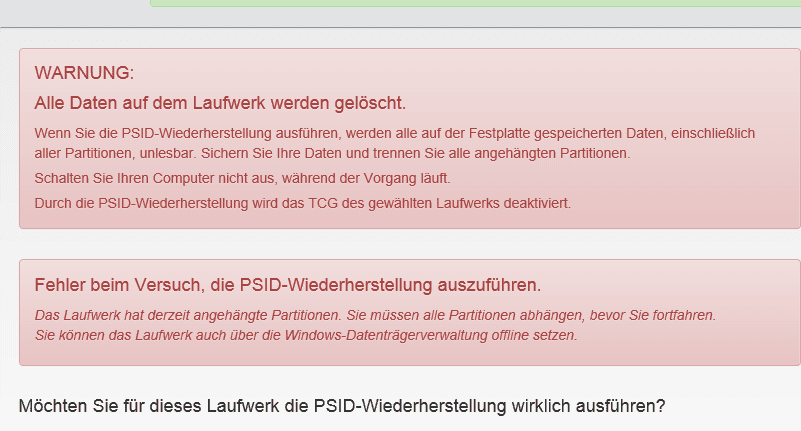 Nachdem ich die PSID eingetragen habe bekomme ich eine Meldung das ich eine Partition abhängen sollte oder offline setzen soll. Was muss ich machen.